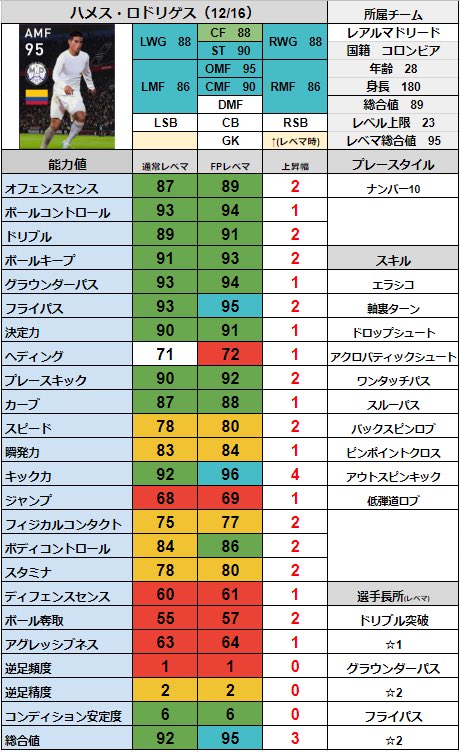 ウイイレアプリ Fpハメス ロドリゲス 12 16 の能力値と評価 ボランチ